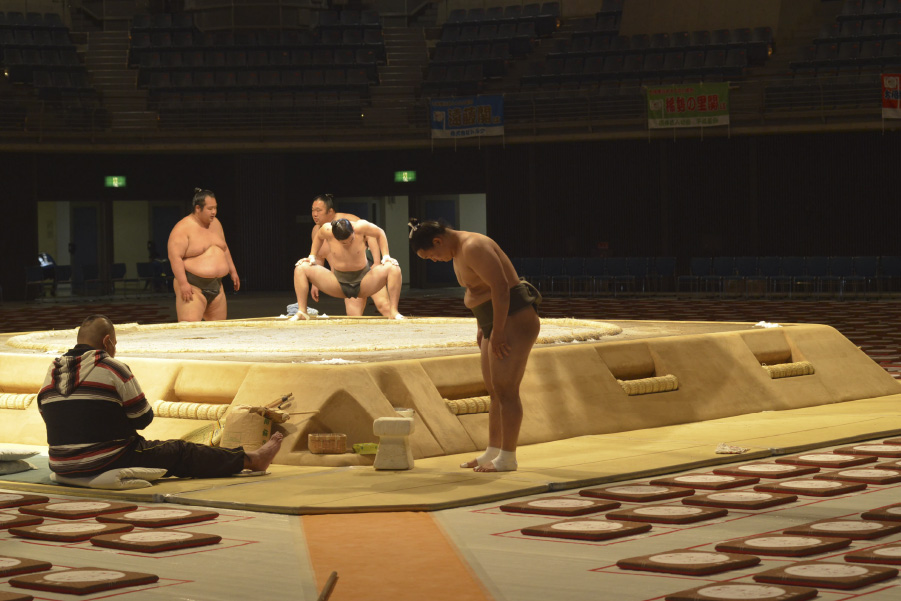 若手の力士が次々に会場入りし、先輩力士が来るまでに支度部屋を整え、練習に励んでおりました。スタッフも総出で最終チェック。会場内の照明やマイクは特別発注し両国と同じ仕様にしてもらいました。